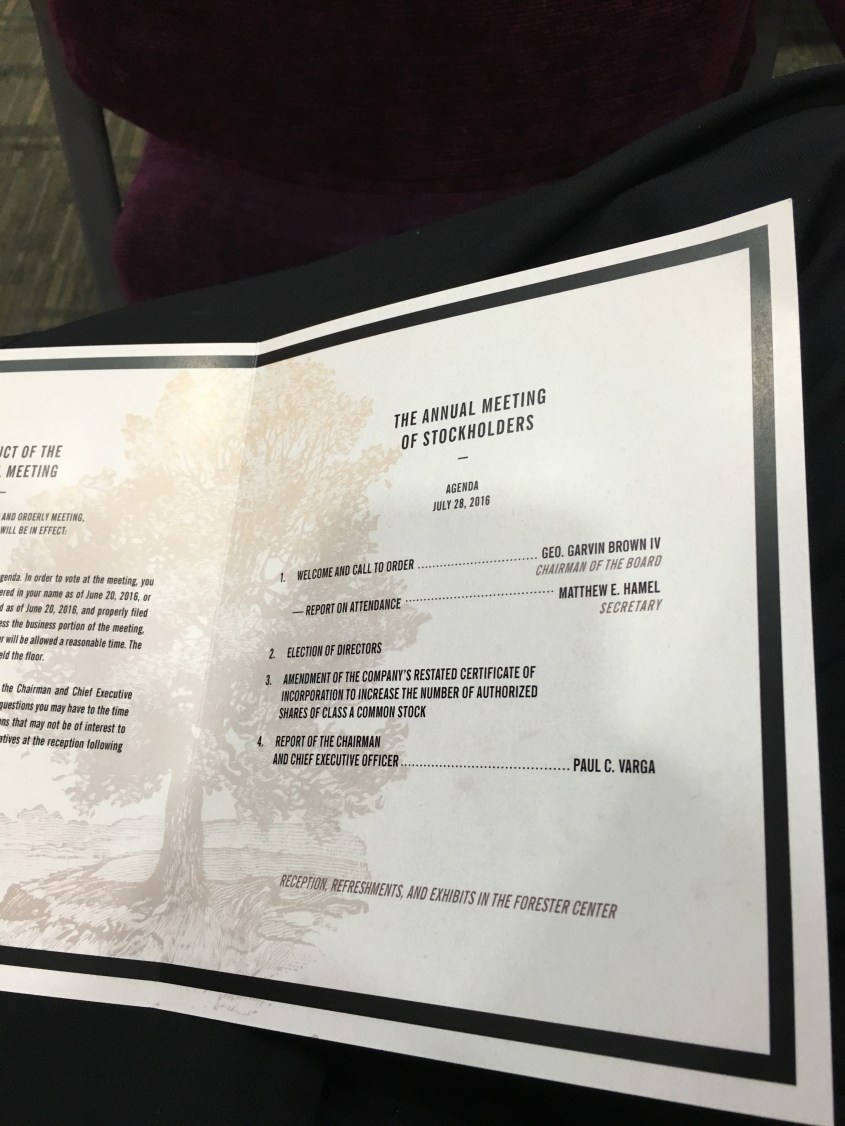 9:03 a.m. Brown-Forman headquarters, 850 Dixie Highway. Waiting for the annual stockholders meeting to begin — and the changing of the Brown family guard.