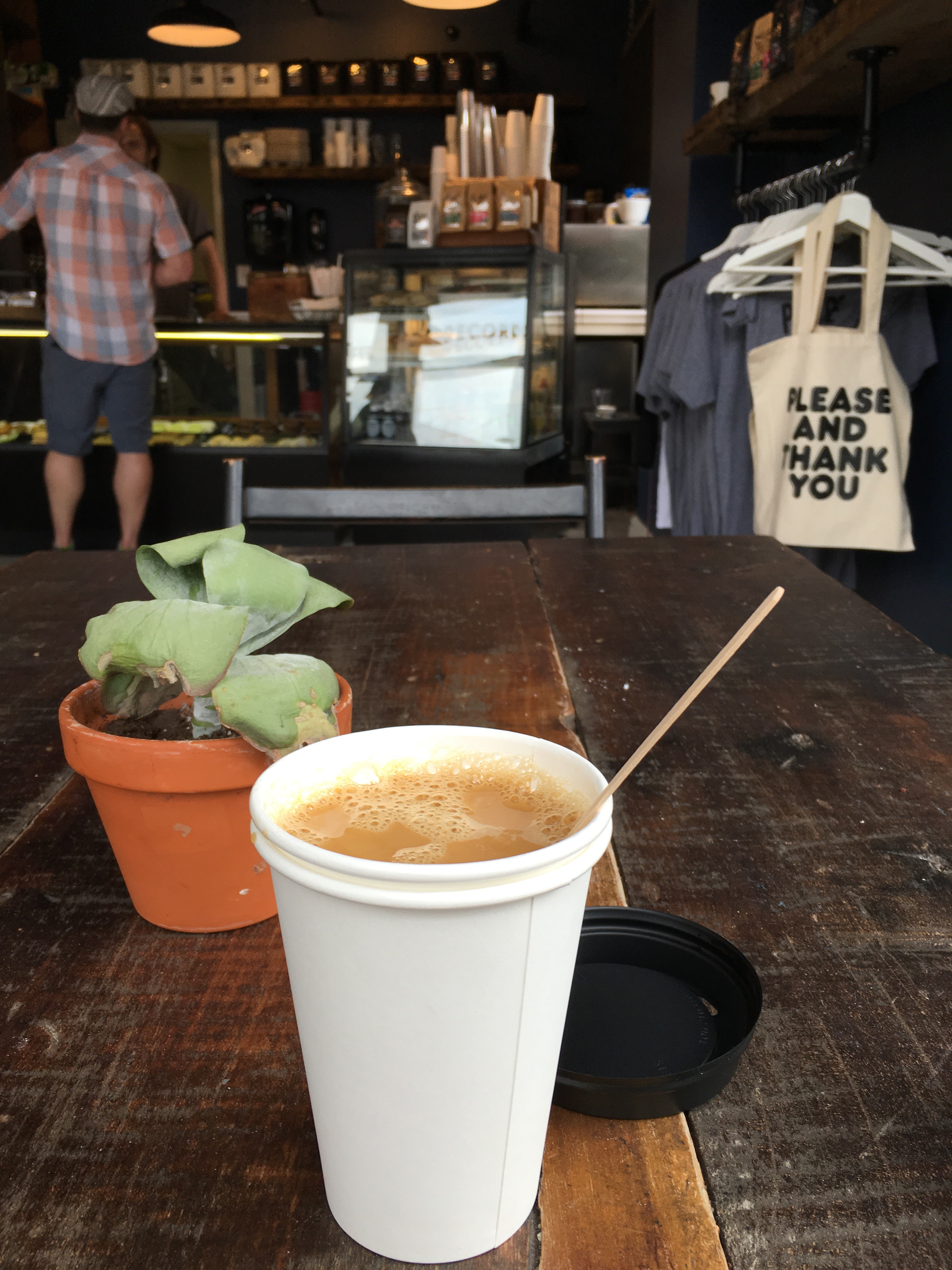 10:35 a.m., Please & Thank You on East Market in NuLu. They’re playing Isaac Hayes’ “Joy” from 1973 — on an LP. How do we know? It skipped! A small coffee made from Good Folks beans: $3, with a generous tip.