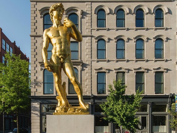 Pictured, top: Conceptual artist Serkan Özkaya‘s 30-foot-tall version of Michelangelo’s David, which 21c’s owners commissioned and installed in front of the hotel in 2011.